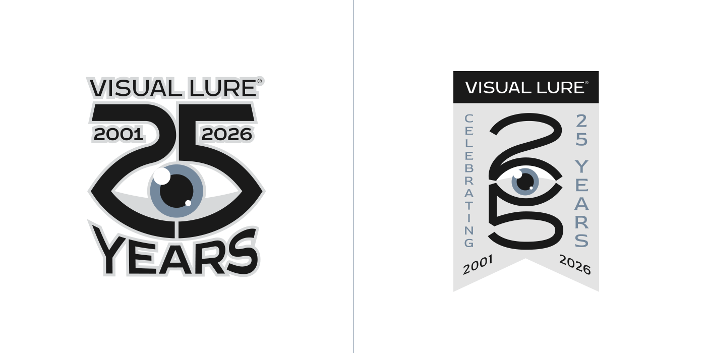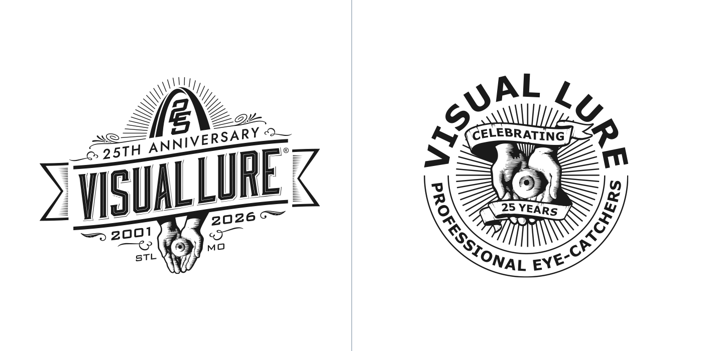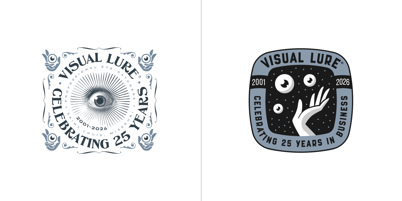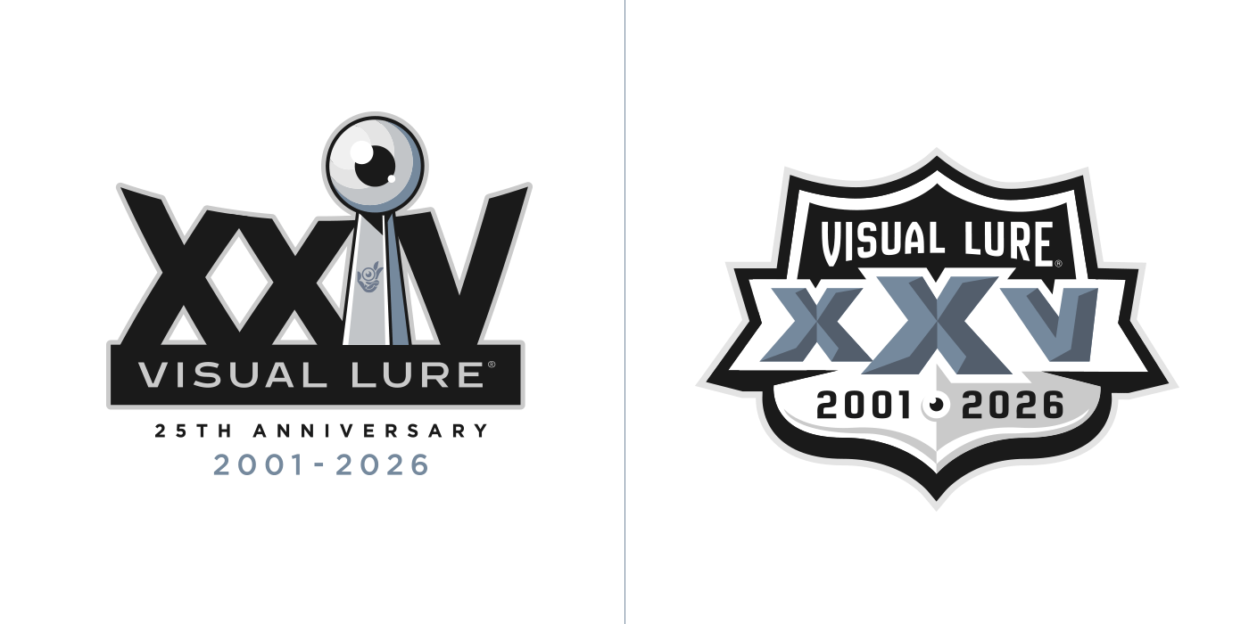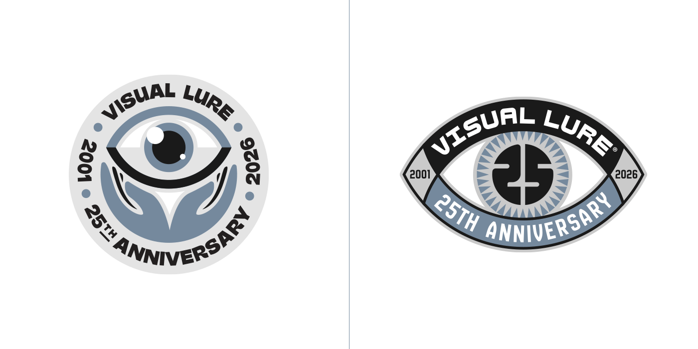 In 2026, Visual Lure will celebrate 25 years in business, so I decided to create a special 25th-anniversary logo to mark the occasion. I started sketching and came up with about six solid concepts, then began rendering them out. Over the next few days, new ideas kept comingโone after anotherโuntil I had around fifteen. At that point, I figured I might as well see if I could reach twenty-five. I revisited a few old anniversary logos and other Visual Lure logo explorations, reworking them into 25th-anniversary versions, and eventually hit the goal. Here they are, in all their glory, along with brief descriptions of how each one came to be.