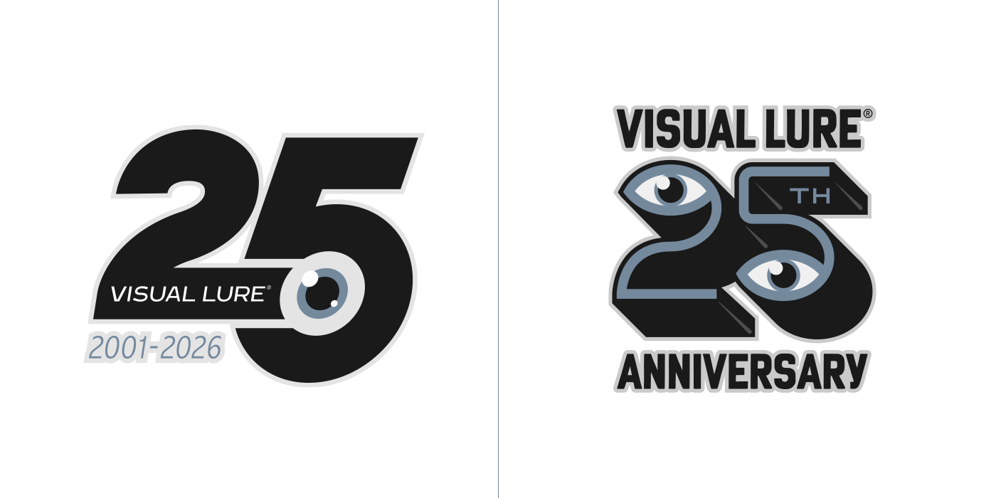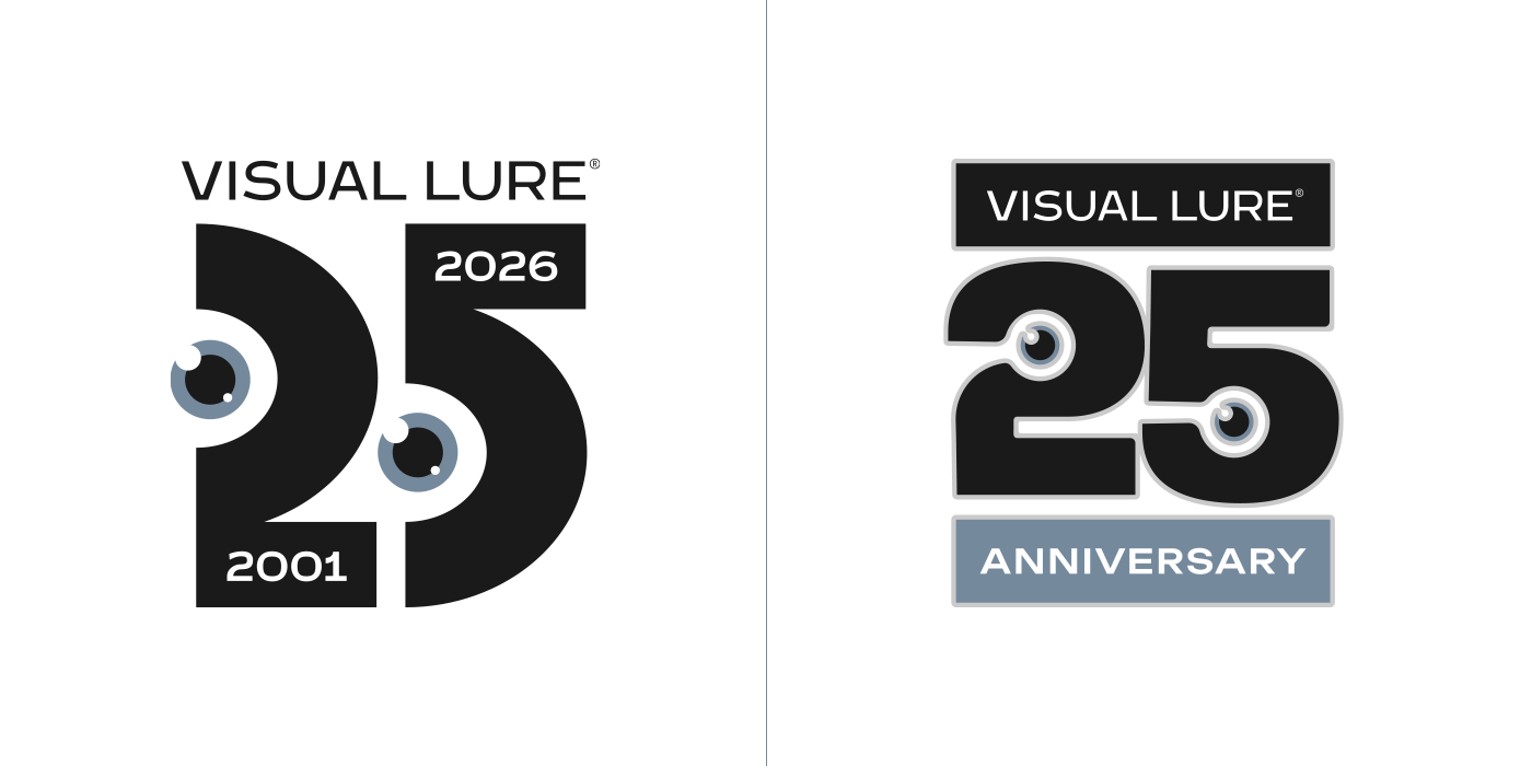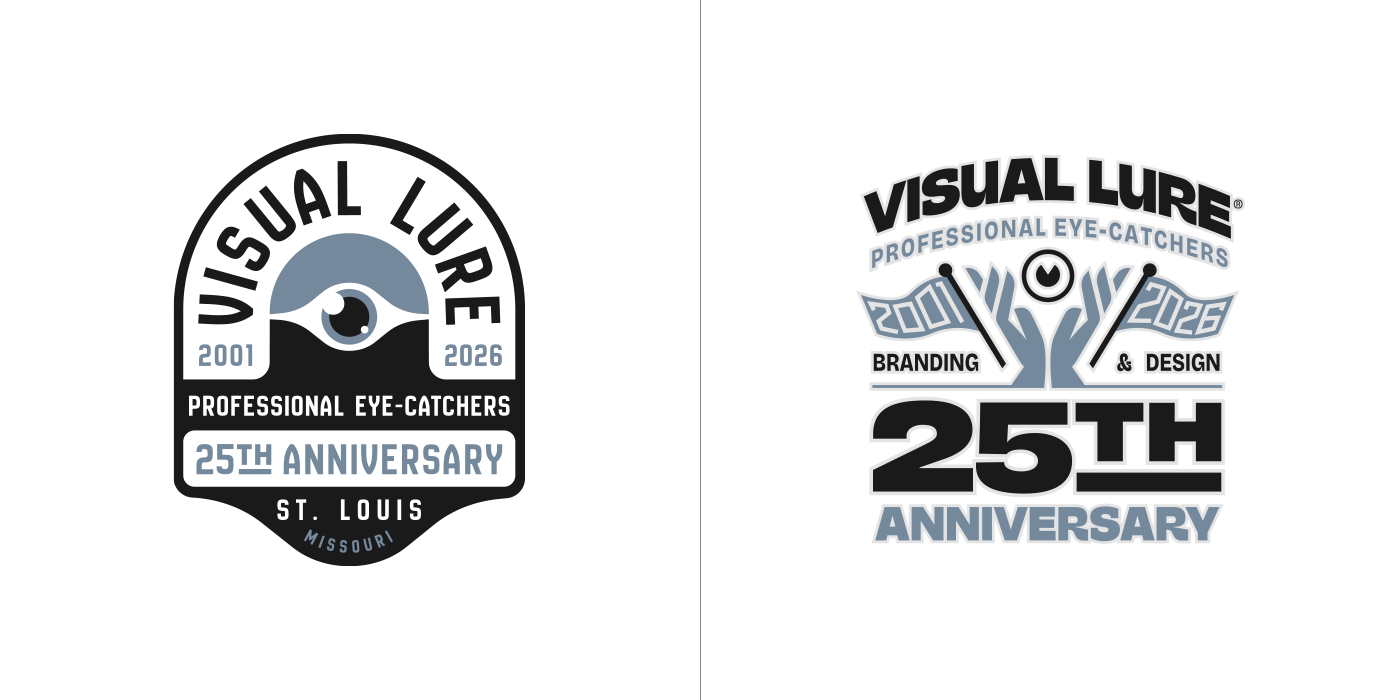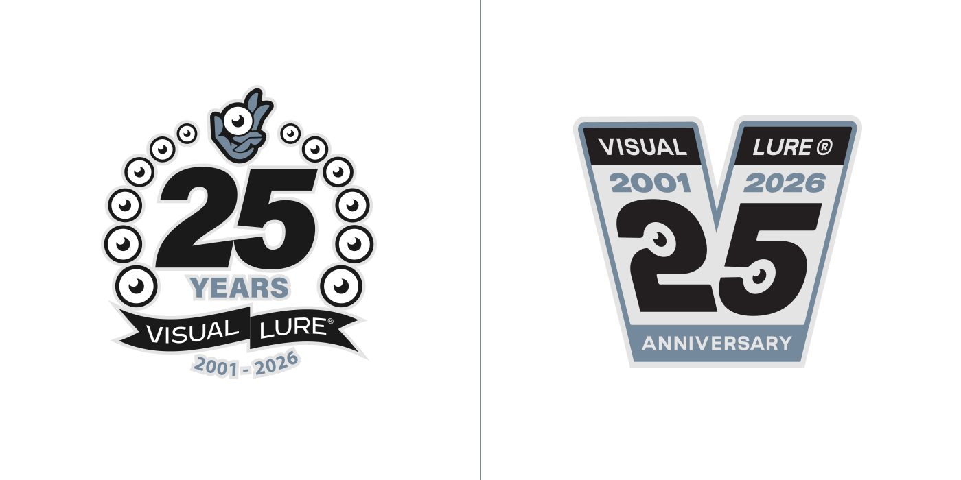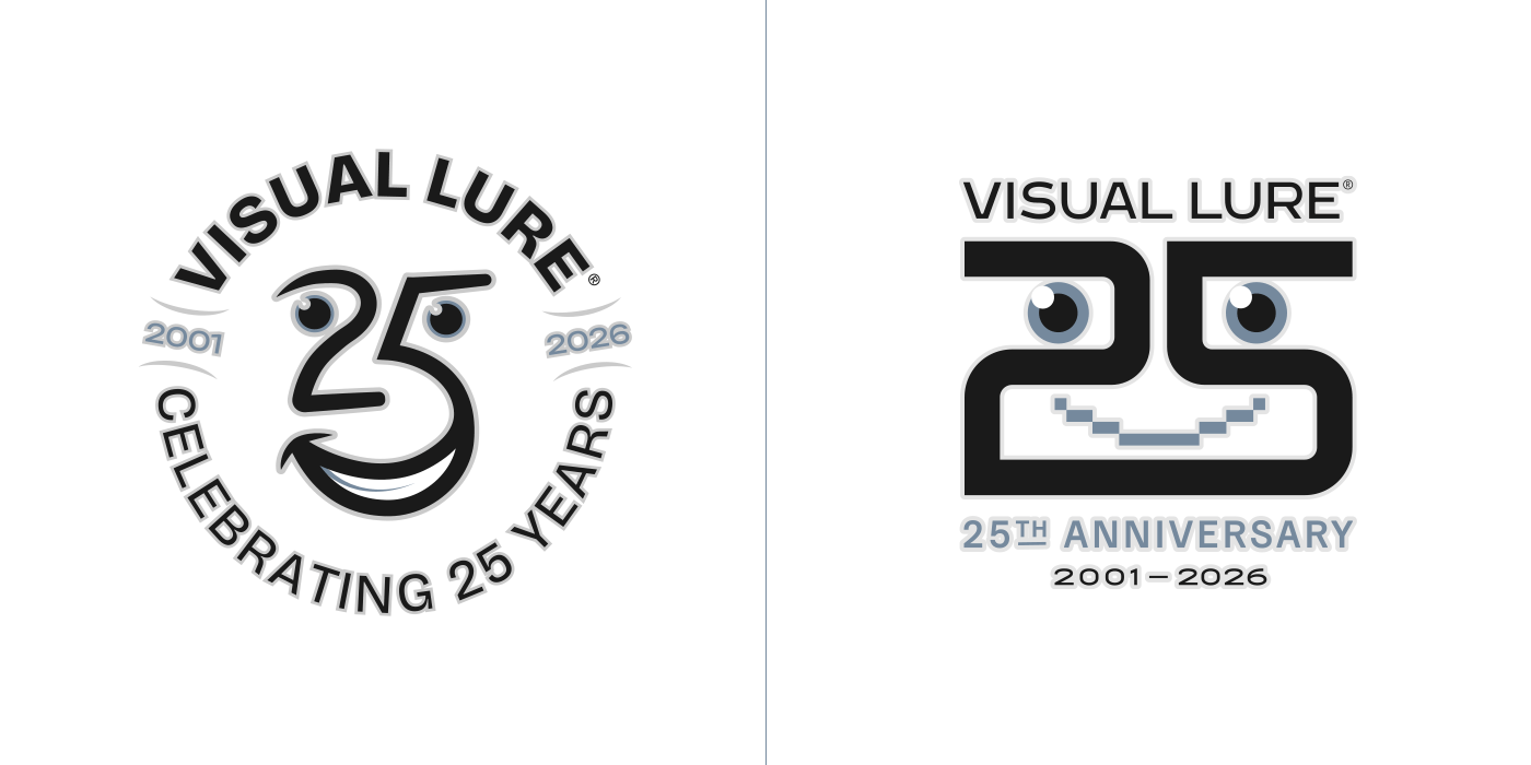 In 2026, Visual Lure will celebrate 25 years in business, so I decided to create a special 25th-anniversary logo to mark the occasion. I started sketching and came up with about six solid concepts, then began rendering them out. Over the next few days, new ideas kept comingโone after anotherโuntil I had around fifteen. At that point, I figured I might as well see if I could reach twenty-five. I revisited a few old anniversary logos and other Visual Lure logo explorations, reworking them into 25th-anniversary versions, and eventually hit the goal. Here they are, in all their glory, along with brief descriptions of how each one came to be.