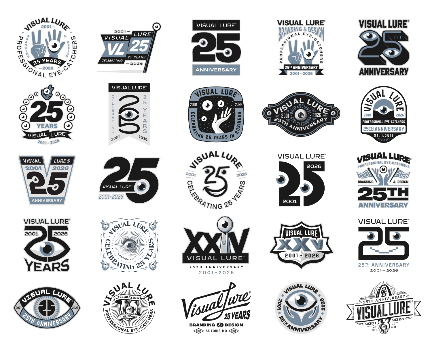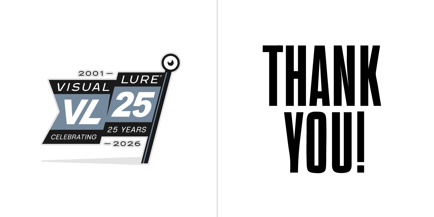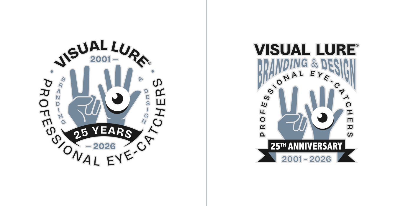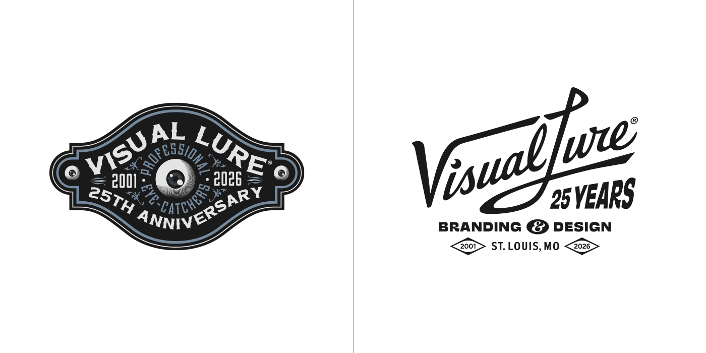 In 2026, Visual Lure will celebrate 25 years in business, so I decided to create a special 25th-anniversary logo to mark the occasion. I started sketching and came up with about six solid concepts, then began rendering them out. Over the next few days, new ideas kept comingโone after anotherโuntil I had around fifteen. At that point, I figured I might as well see if I could reach twenty-five. I revisited a few old anniversary logos and other Visual Lure logo explorations, reworking them into 25th-anniversary versions, and eventually hit the goal. Here they are, in all their glory, along with brief descriptions of how each one came to be.